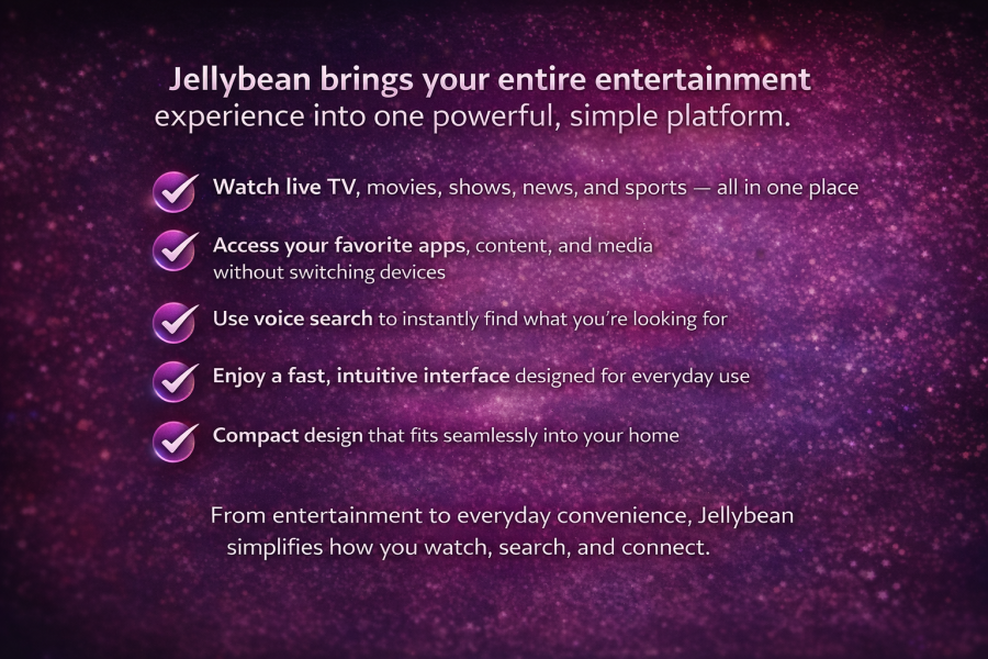 Watch movies, tv shows, news, sports and other live or on-demand content whenever and wherever you want., Work on your office documents, email, connect with friend through social network, chat, surf the net, voice and video conference and more, Play games, listen to your favourite music, show off your video and picture library, pick an exercise program, etc. all through one small box that fits in the palm of your hands and in the convenience of your living room, In a hurry or going away on vacation? JellyBean is region aware and can provide helpful local information when travelling, Our proprietary voice navigation and intuitive search engine gives you easy access to requested content, Experience the Taste of Freedom without Boundries and lower your monthly bills