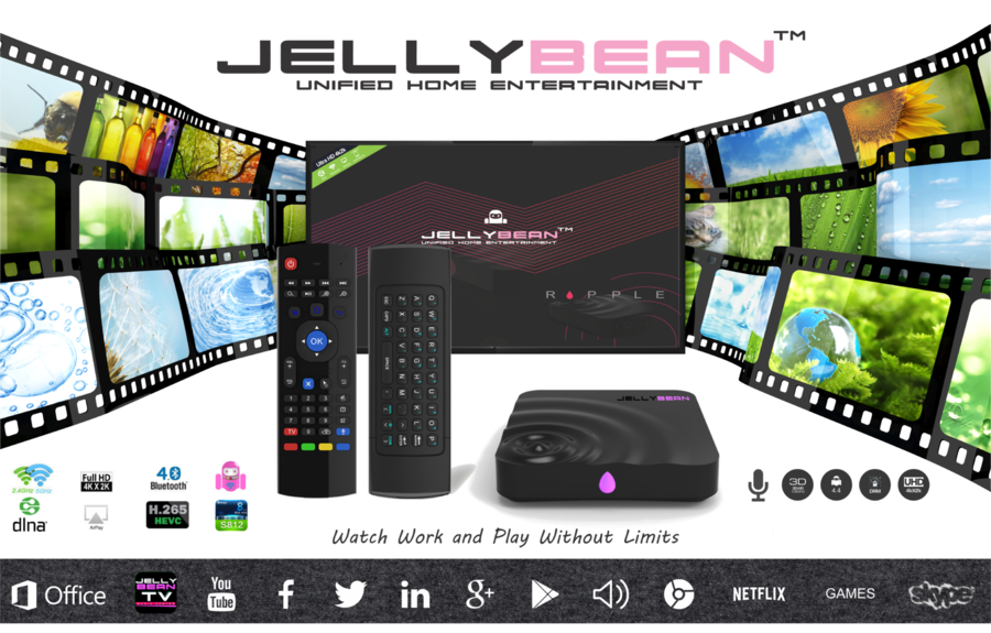 JellyBean is revolutionizing the consumer market with our proprietary unified home entertainment (TM) and media solution. We are becoming the standard for entertainment by providing media and Applications, hardware decoding, insane flexibility and the ability to consolidate all your pre-existing media sources through one JellyBean box. JellyBean UHED features a super fast CPU teamed with a multi Core GPU 3D graphics accelerator giving it stellar performance. Jellybean is a true voice enabled unified home entertainment system. With your JellyBean you have access to social networking services, Instant Messaging services, office applications, voice and video conferencing services, audio and music services, access to popular subscription services, local and regional services, YouTube, games and more. Access these services, applications and content by voice, pointing and clicking on the selected media or through a keyboard. Our proprietary operating system is the most user friendly system available with simple and intuitive management menus, voice enabled navigation and search functions, plus plug and play hardware. This box is so small, you can even take it with you when to decide to give a presentation at work or take a vacation.